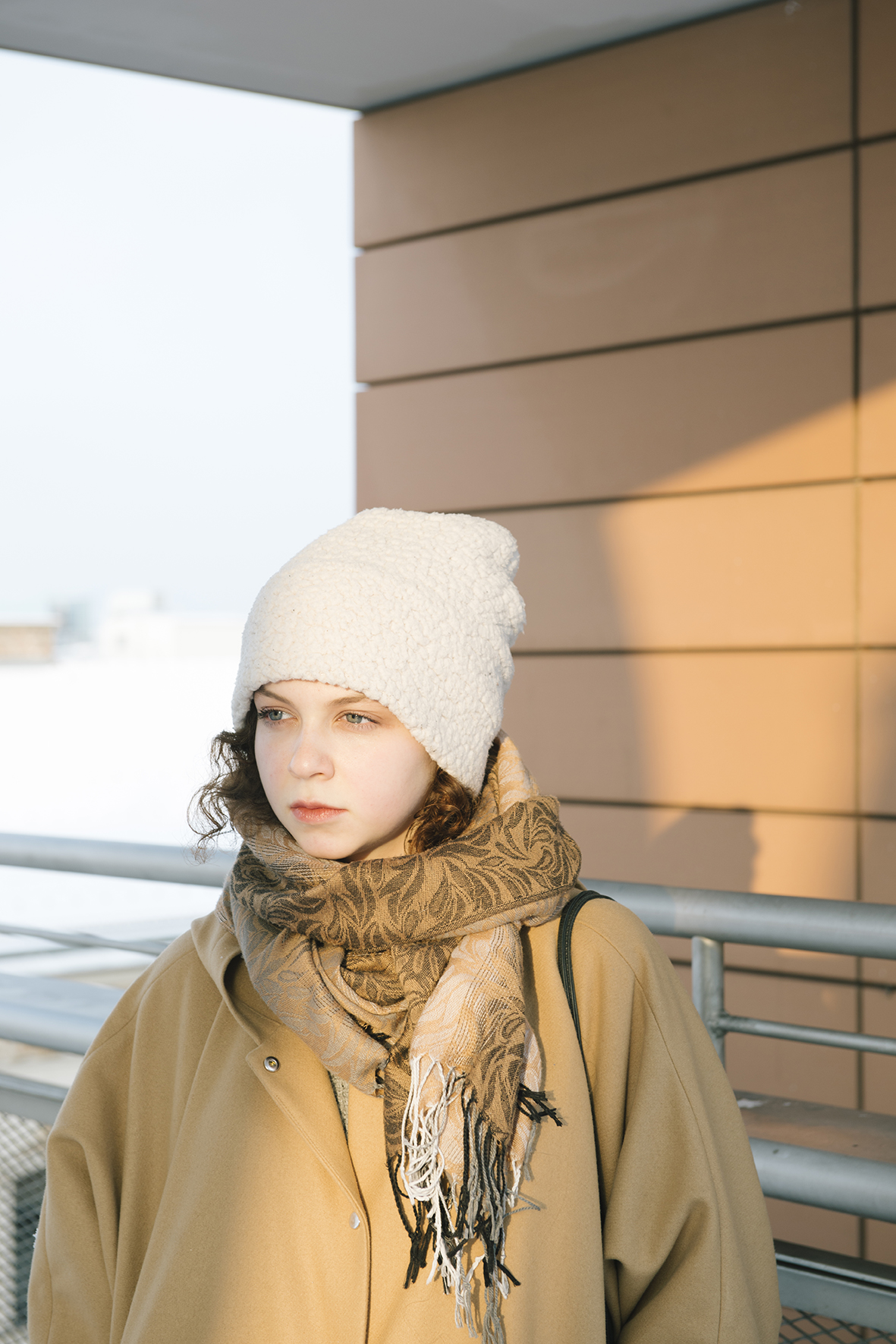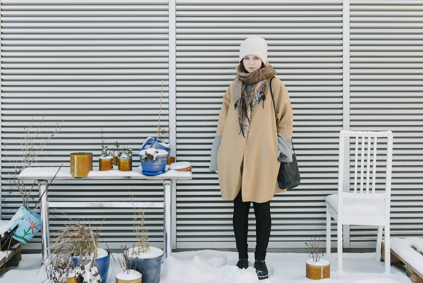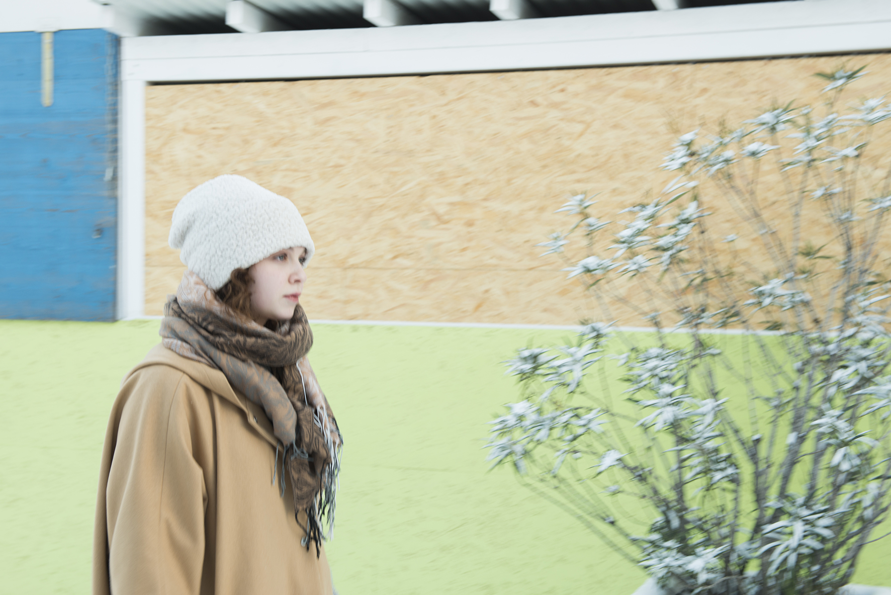 Schön war, dass wir bei unserem Projekt zu jeder Jahreszeit fotografieren konnten. Im Winter fand das Shooting von Victoria statt. Der Schnee passte gut zu der sehr präsenten Farbe Weiß im Film, die immer wieder auftaucht, wie zum Beispiel in der Milchbar oder auch in den Outfits der Drooges.